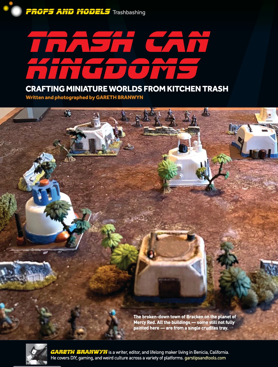 I’m so happy to see my modeling articles in the latest issue of Make:, the “Props, Models, and Miniatures” issue. I did a piece on “trashbashing” (making hobby models out of kitchen trash) and a collection of modeling, painting, and weathering tips. Bill of Bill Making Stuff has a wonderful sidebar in there, too, with his own trashbashing and modeling tips. These articles present many of my top-level takeaways on modeling for tabletop gaming. Here are a few tippy top tips: